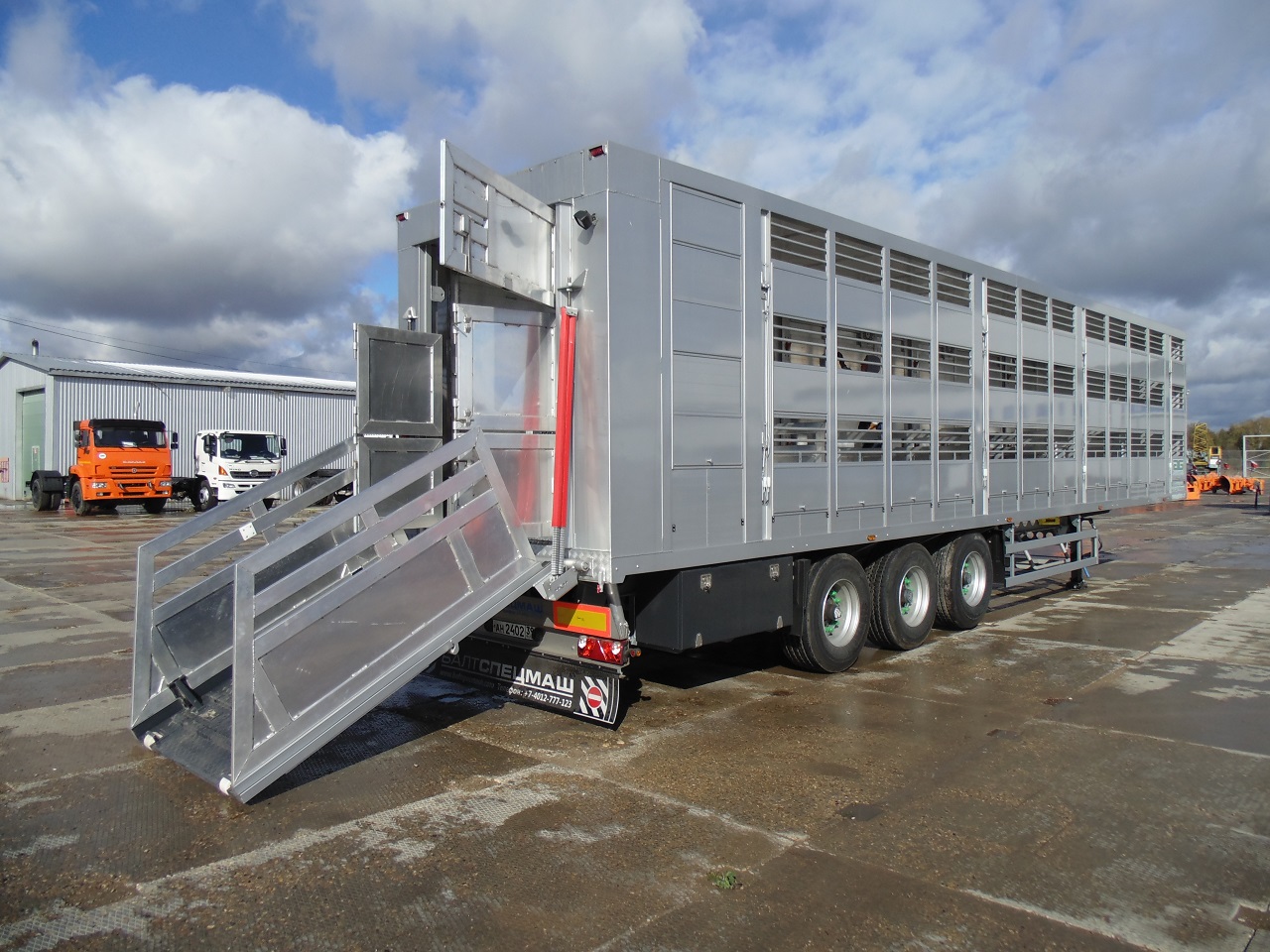 В наличии на нашей стоянке появился новый полуприцеп производства «Балтспецмаш» модели 94531 модификация «Лифтинг» предназначен для перевозки живых животных с трехэтажной загрузкой. Надстройка полностью изготовлена из алюминиевого сплава.